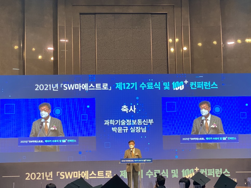 다음으로는 과학기술정보통신부 박윤규 실장님의 축사가 진행되었습니다. "수료를 명예스럽게 하게 된 것을 축하드립니다. 16일에도 선배들과 함께하는 행사인 100+ 컨퍼런스가 진행되는 것으로 알고 있습니다. 온라인과 오프라인으로 참여해주신 12기 모든 수료생 축하드립니다."라며 언급하였는데요.