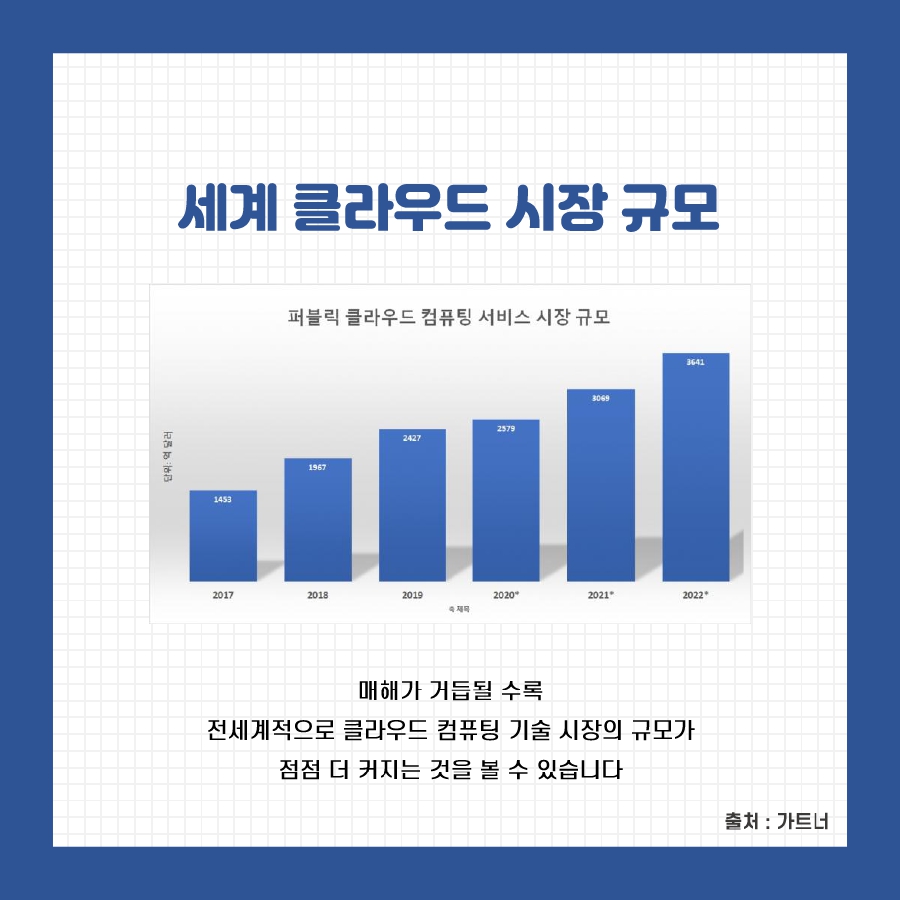 매회가 거듭될수록 전세계적으로 클라우드 컴퓨팅 기술 시장의 규모가 점점 더 커지는 것을 볼 수 있습니다.