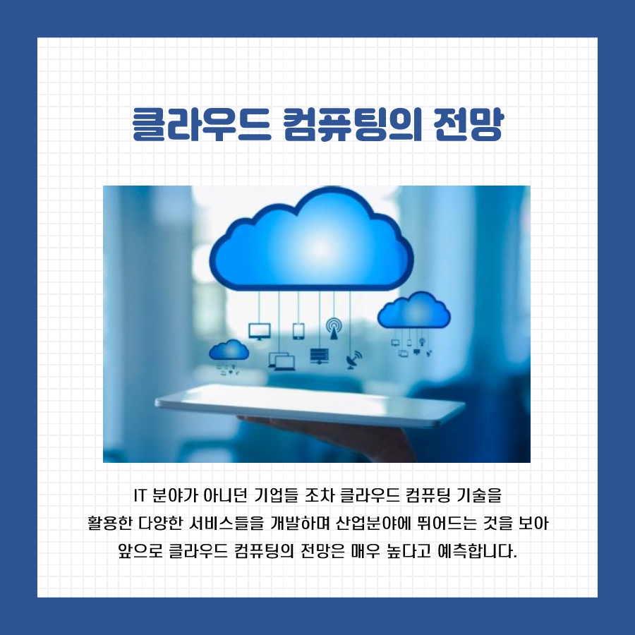클라우드 컴퓨팅의 전망으로는 IT 분야가 아니던 기업들 조차 클라우드 컴퓨팅 기술을 활용한 다양한 서비스들을 개발하며,