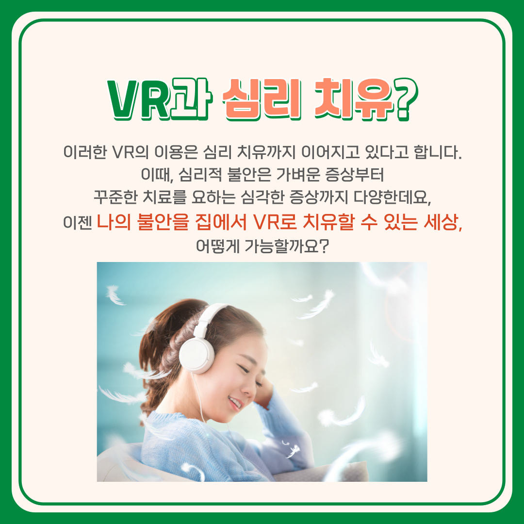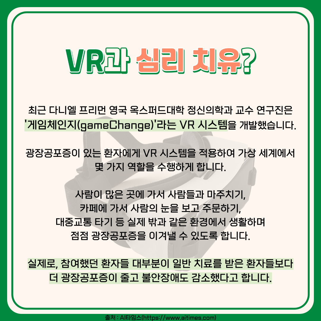그런데 이 VR이 사람의 심리 치유 효과에도 긍정적인 영향을 준다고 해요.