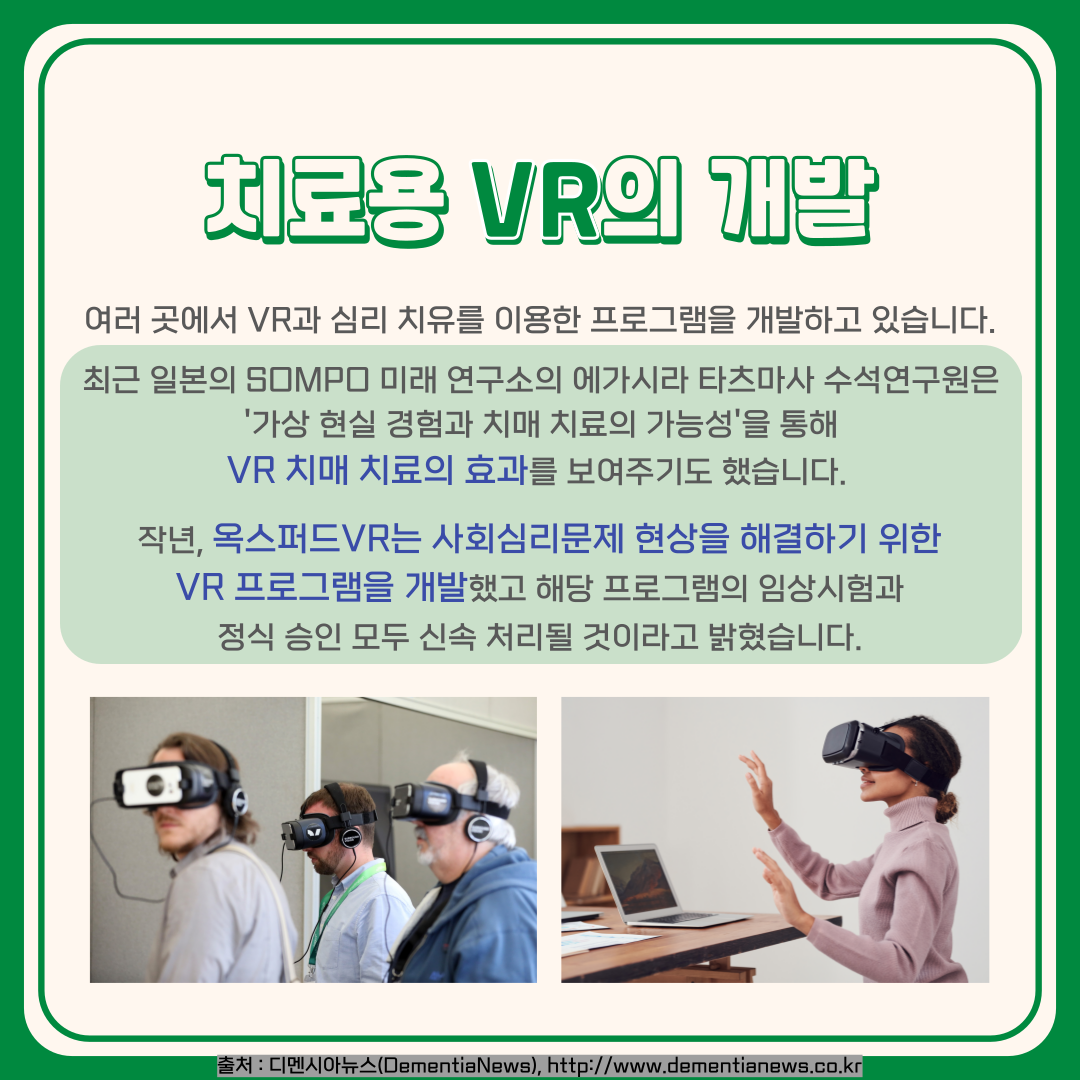 이미 VR 치매 치료의 가능성을 보았다고 하는데, 하루 빨리 상용화 되었으면 좋겠네요.