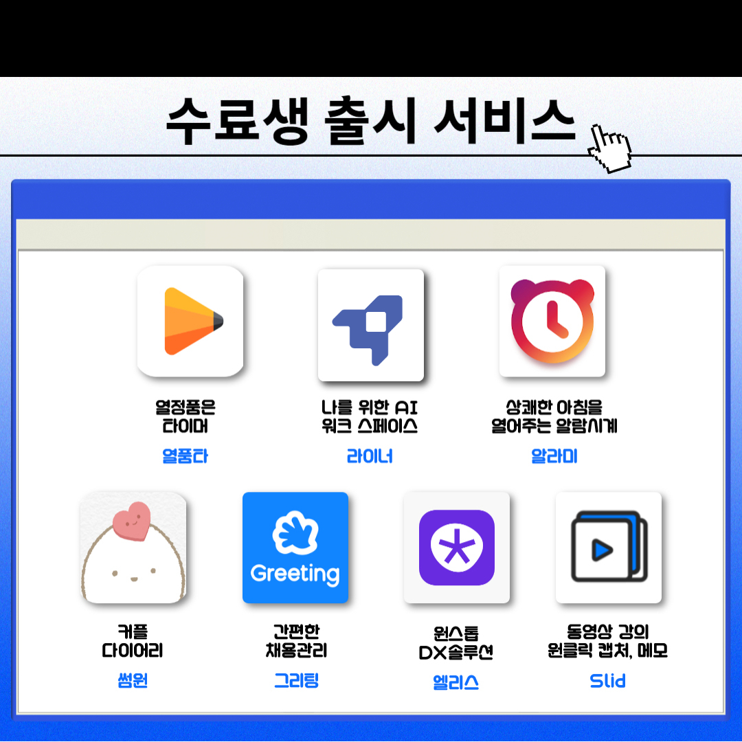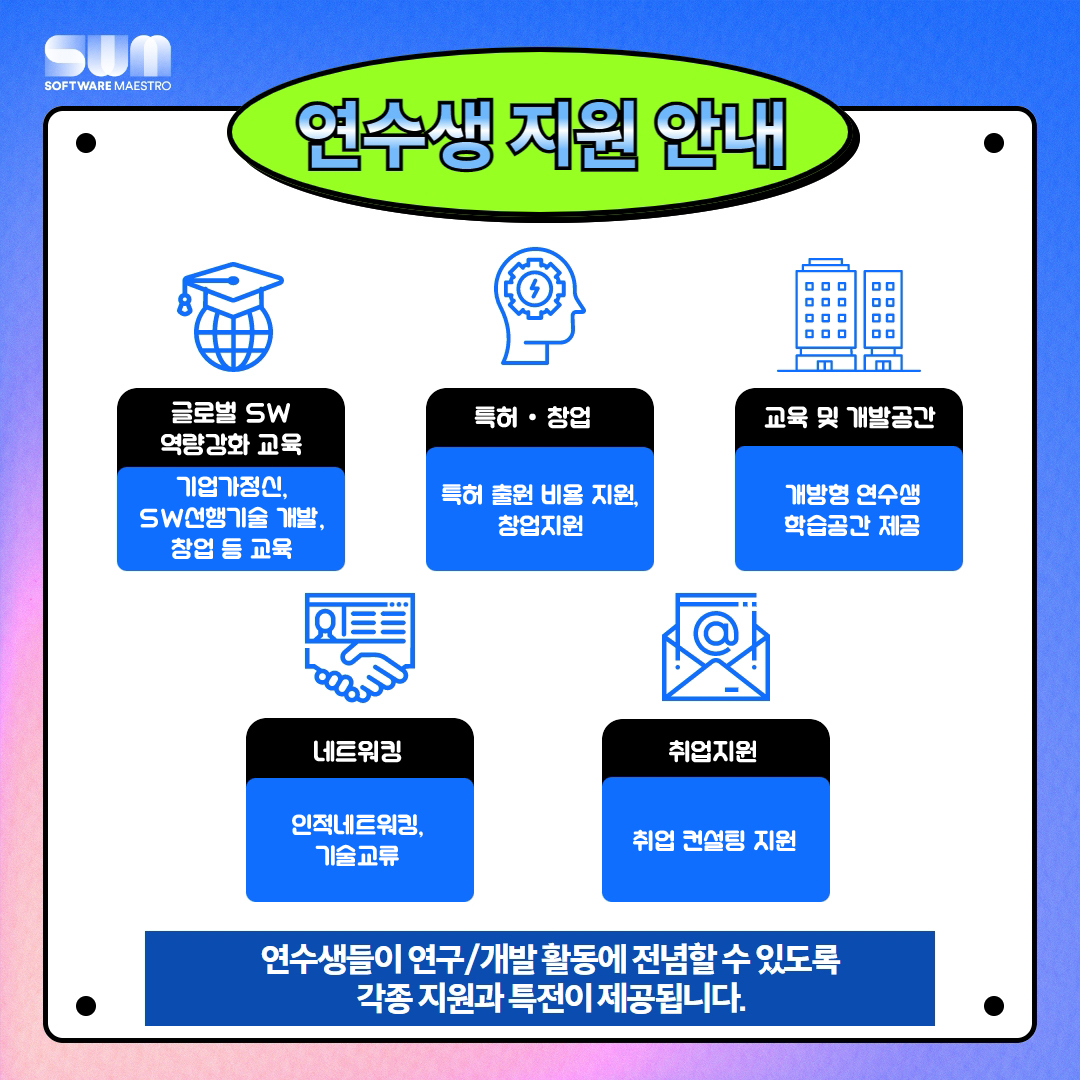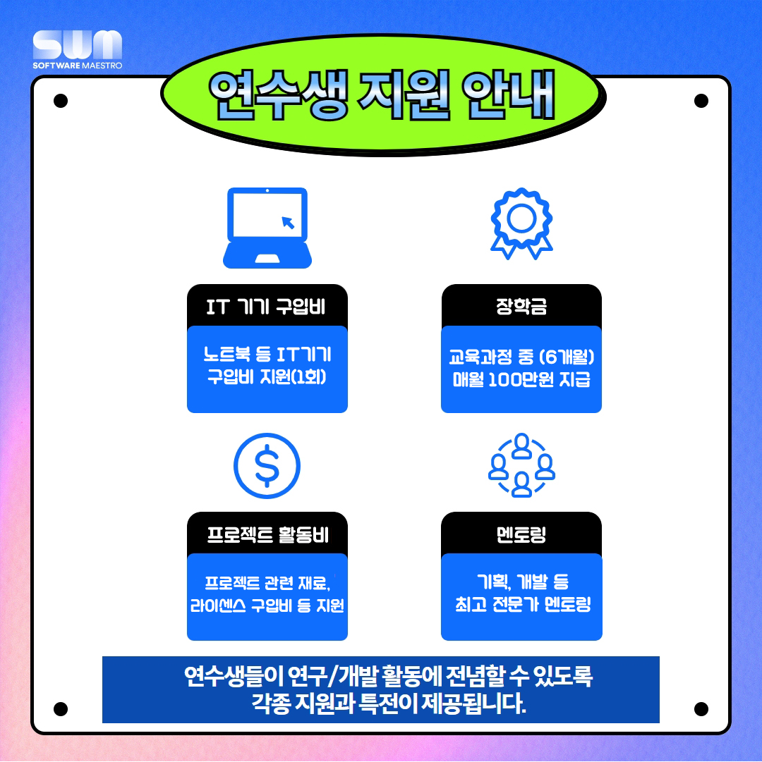 - 프로젝트 개발에만 전념할 수 있도록 각종 지원과 특전이 제공됩니다.