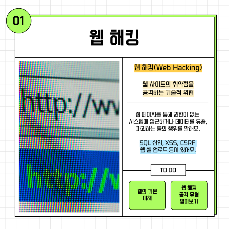 웹에 대한 기본적인 이해와 웹 해킹의 공격 유형을 알아보는 것이 필요해요.