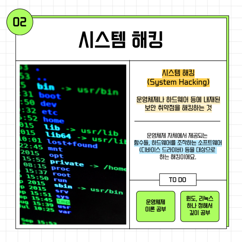 시스템 해킹은 운영체제나 하드웨어 등에 내재된 보안 취약점을 이용하는 해킹입니다.