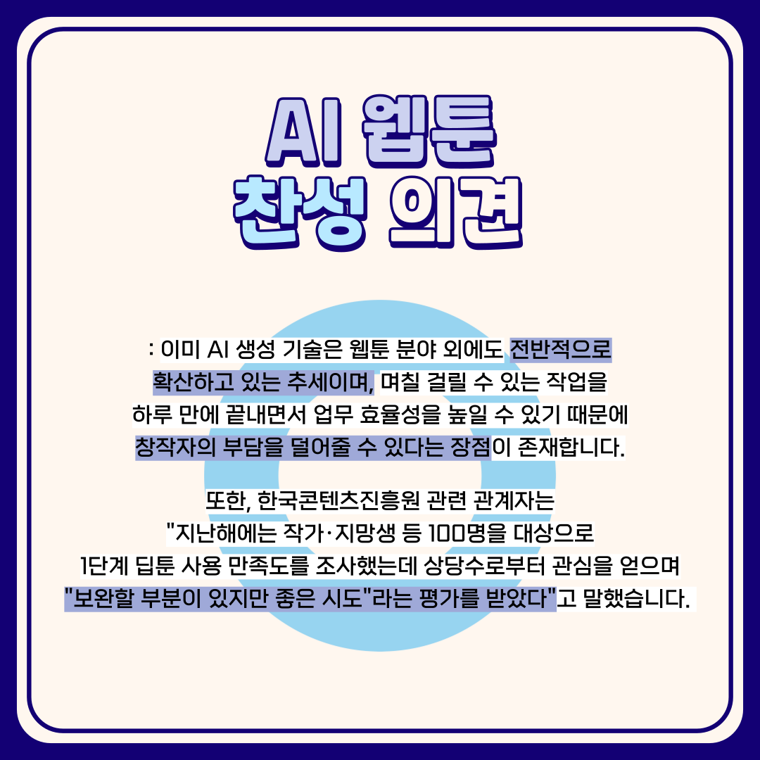 찬성하는 쪽은 창작자의 부담을 덜어주고 업무 효율성을 높일 수 있다는 점에서 장점을 강조하고 있습니다.