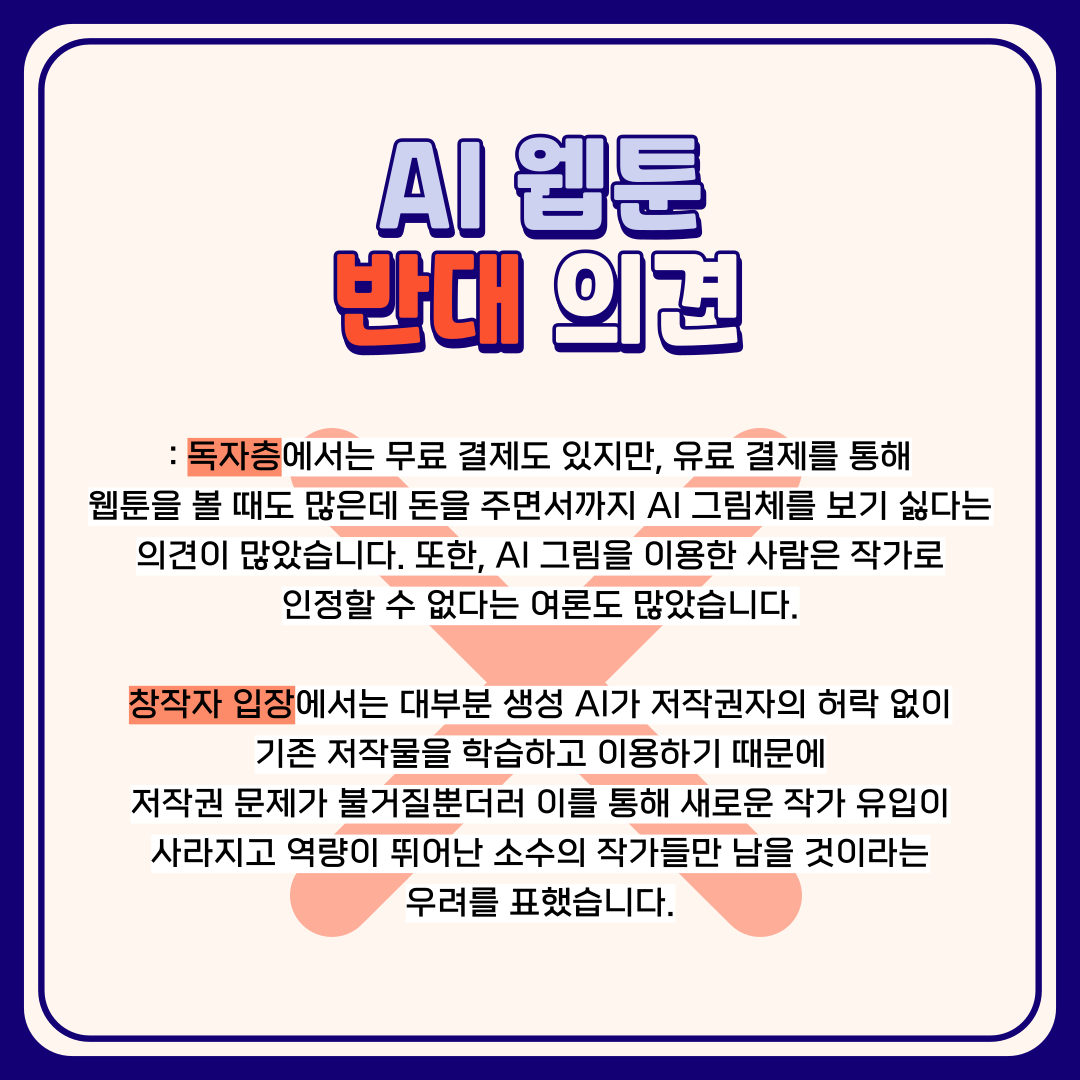 반대 의견은 독자 입장에서 돈을 주고 AI 웹툰을 보고 싶지 않다는 것과