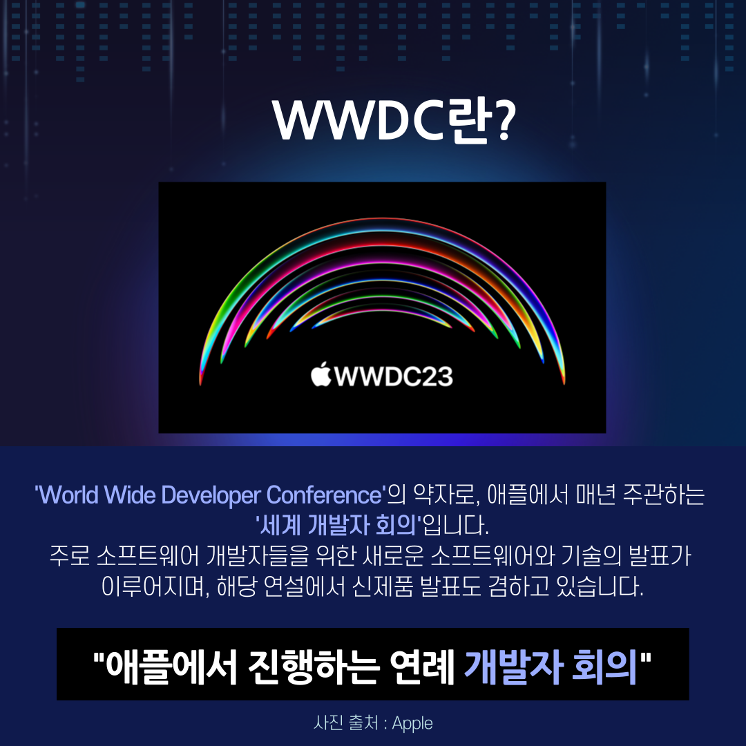 'World Wide Developer Conference'의 약자로, 애플에서 매년 주관하는 '세계 개발자 회의'를 의미합니다.