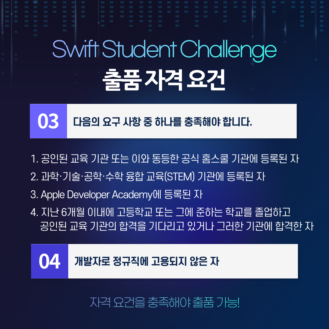 몇 가지 자격요건을 충족하는 사람이라면 누구나 참여할 수 있는 iOS 앱 개발 공모전이고, Swift Playground 앱을 이용하여 제작해서 출품해야 합니다.