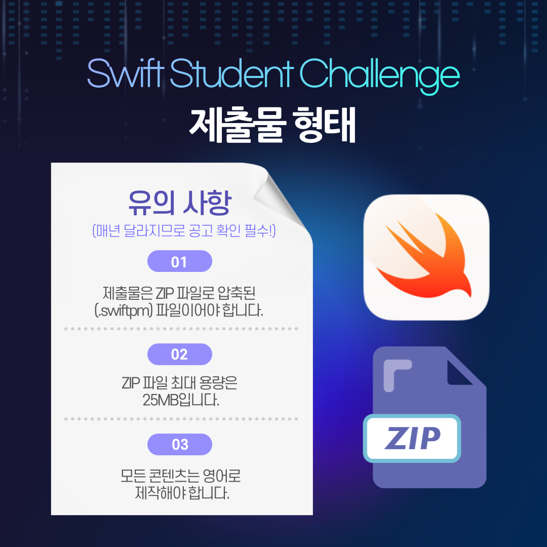또한 압축된 파일이어야 하며, 애플 본사에서 진행하는 공모전인 만큼 모든 콘텐츠는 영어로 제작해야 한다는 점이 특징입니다!