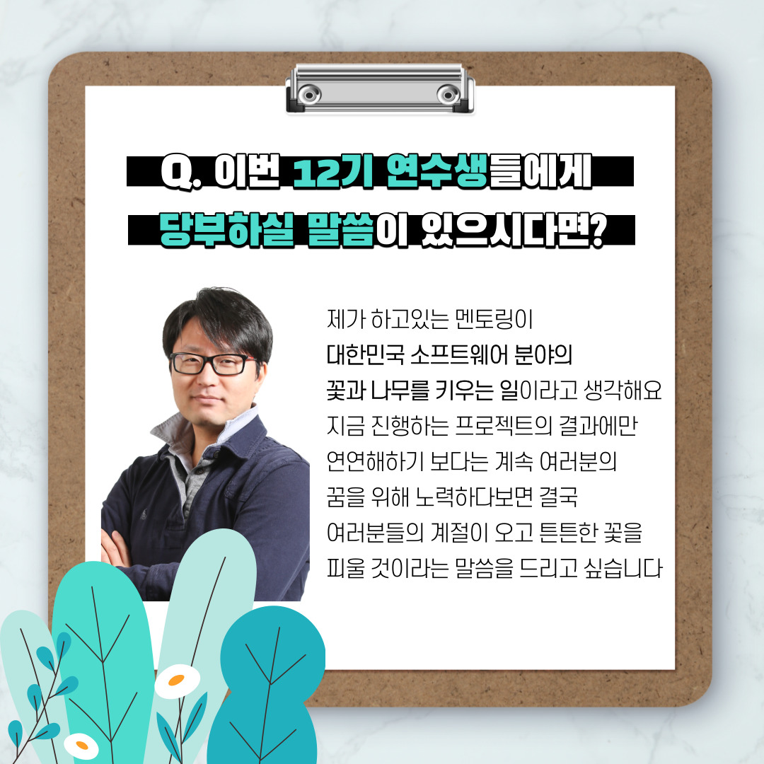 저는 소마에서 하는 멘토링이 대한민국 소프트웨어 정원에 어린 꽃과 나무를 키우는 일이라고 생각해요.
