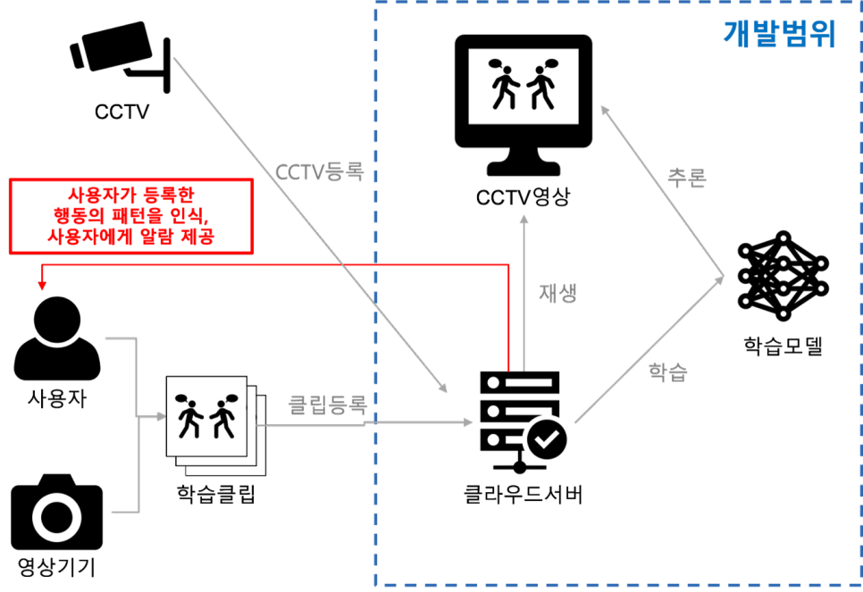 저희는 사용자 CCTV에서 사용자가 원하는 이상행동을 탐지할 수 있게 해주는 서비스를 개발하고 있습니다.