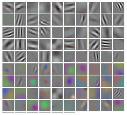 아래 그림은 Conv1의 필터가 보는 값을 가시화 한 것입니다. 더 깊은 계층(layer)을 쌓을수록, 더 비선형적인 특징들을 구해낼 수 있습니다.