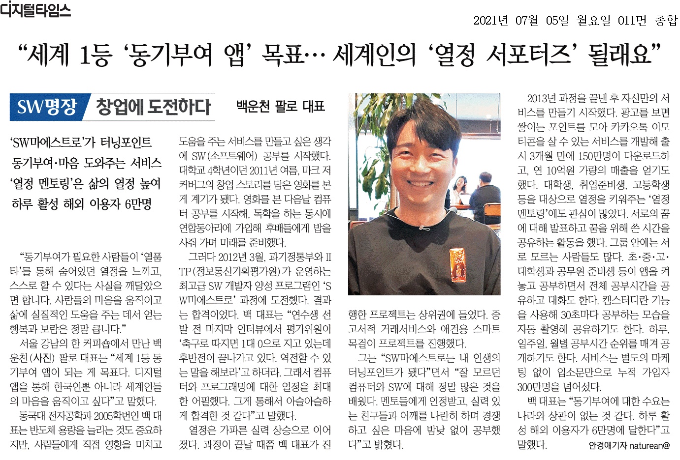 "세계 1등 `동기부여 앱` 목표… 세계인의 `열정 서포터즈` 될래요"